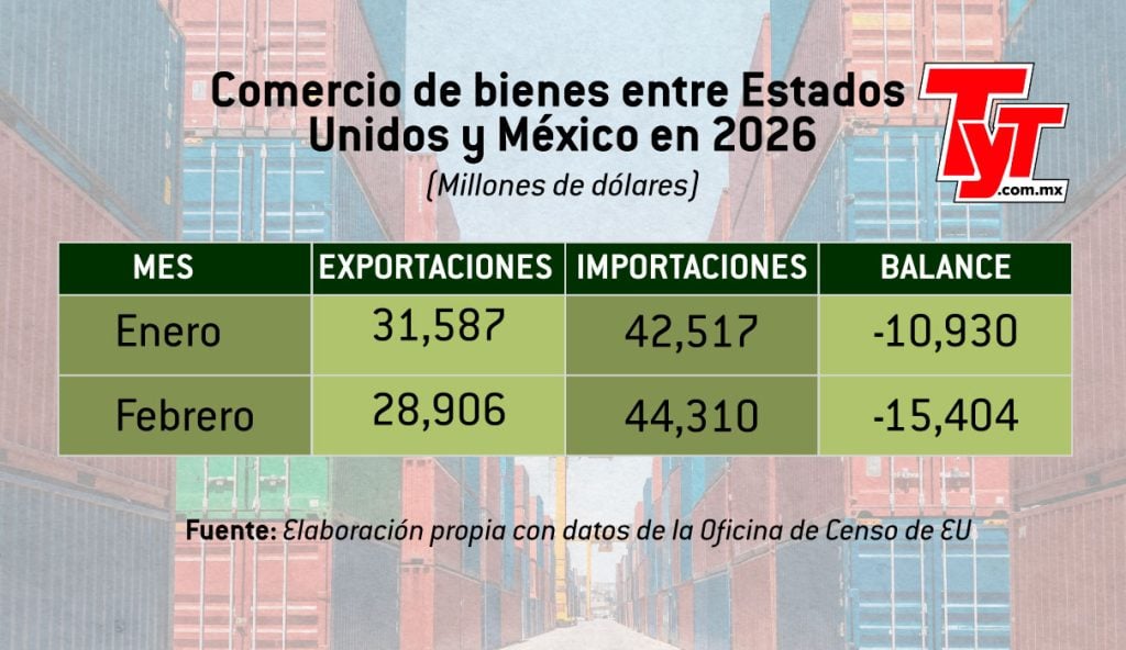 En sentido inverso, Estados Unidos vendió a México productos por un valor de 28,906 millones de dólares, un aumento de 8% frente al mismo mes de 2025.