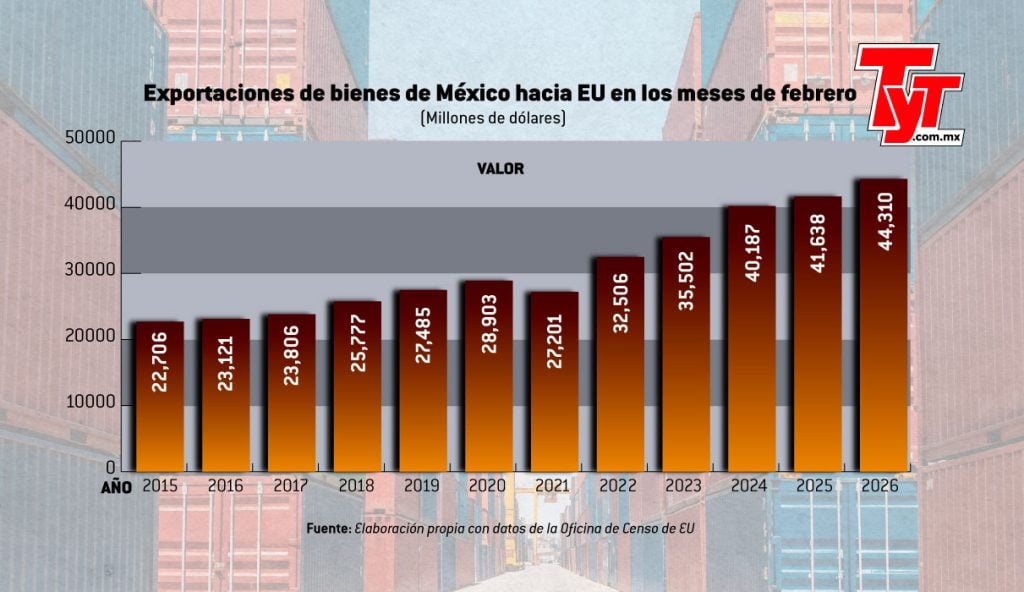En febrero, los envíos de bienes desde México al mercado estadounidense sumaron 44 mil 311 millones de dólares, lo que representó un incremento anual de 6.4%, su mayor variación porcentual desde 2024, cuando las exportaciones crecieron 13.2%.
